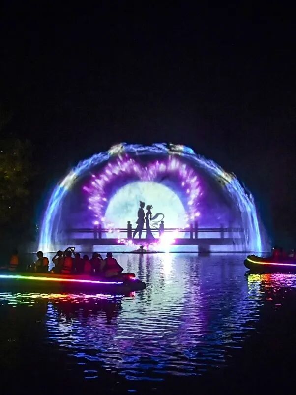 白天的九龍潭是青山綠水,入夜后直接變身魔法世界!坐上皮劃艇劃過水面,兩岸的崖壁突然 “活” 了 —— 燈光投射出牛郎織女鵲橋相會的動畫,連浪花里都閃著星星碎光~