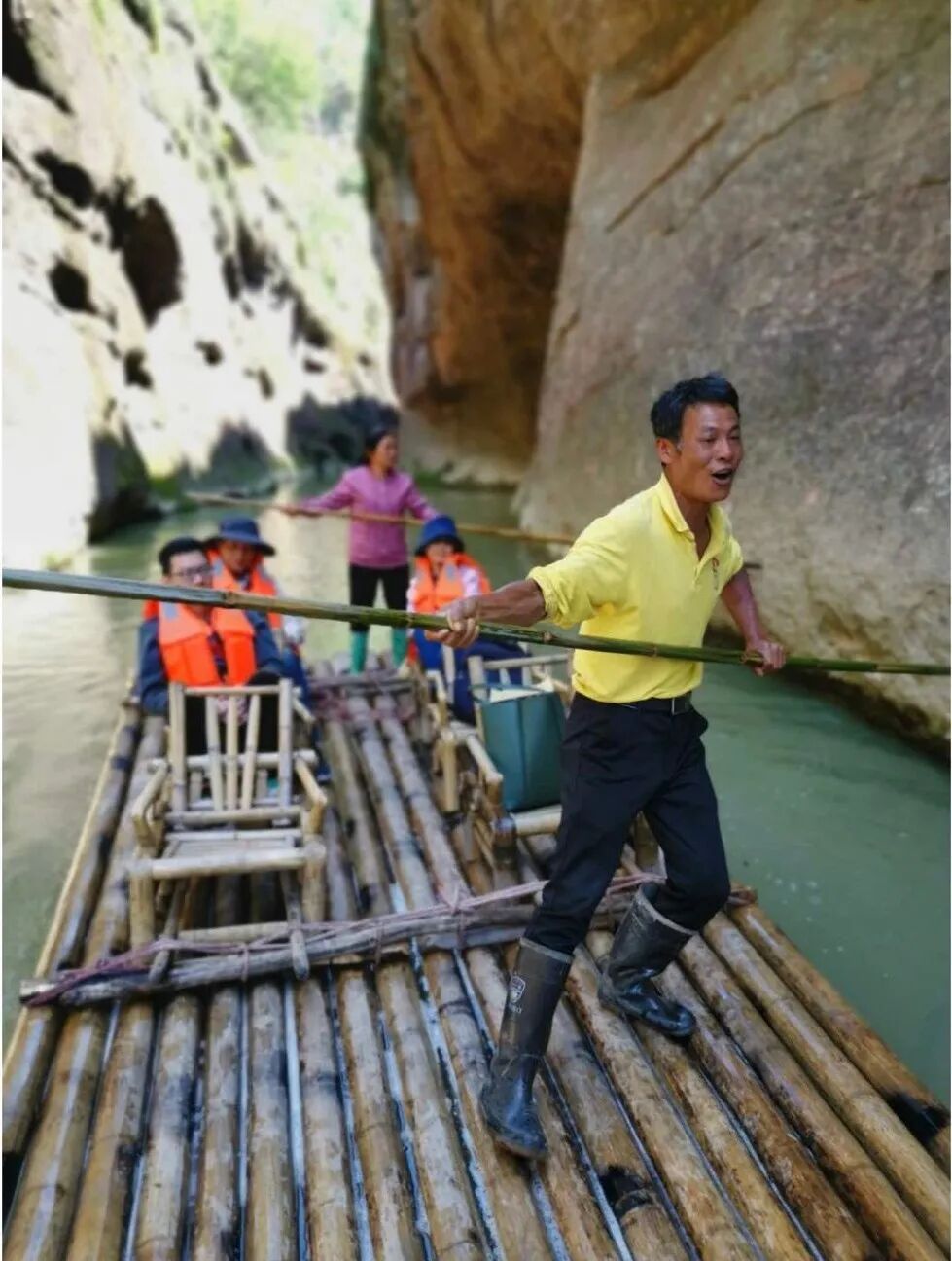 今年56歲的黃盛騰出生在杉城鎮長興村的一個普通農民家庭,從小在上清溪邊長大。20多年前,泰寧旅游產業蓬勃發展,黃盛騰和妻子抓住機遇,開始從事上清溪排工工作,從此,他們一家的生活發生了翻天覆地的變化。 從崇際村到長興村,16.5公里的水路,黃盛騰邊撐桿邊與游客閑聊,講述當地的風土人情,偶爾插科打諢,甚至用幾句英語調節氣氛。“有時接待國際友人,說點英語能讓氣氛更活躍。”憑借精湛的撐竹排技術和熱情洋溢的講解風格,黃盛騰和妻子贏得了無數游客的喜愛和贊譽。 25年風雨兼程, 一葉竹排“撐”起了 黃盛騰一家的美好生活。