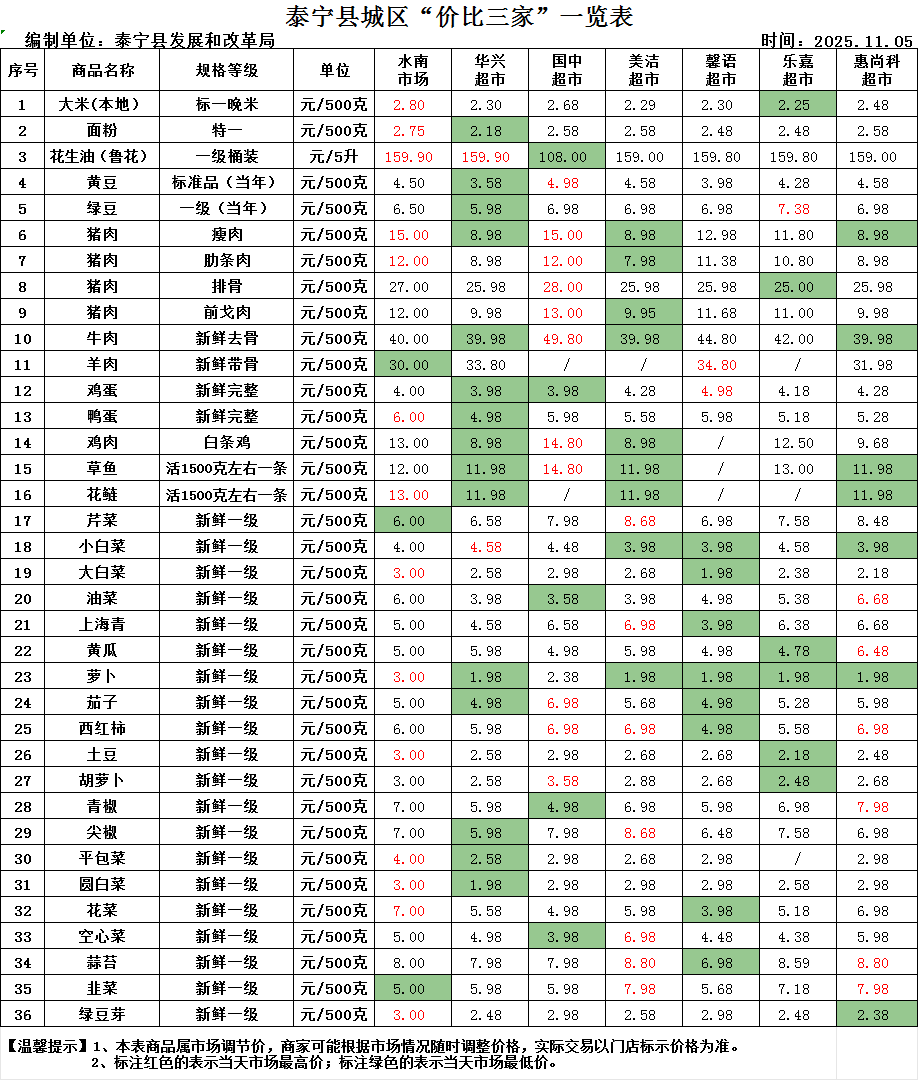 近期,為做好重要民生商品保障需求,保持市場價格穩定,維護正常市場秩序,縣發改局從城區水南市場、華興超市、國中超市、美潔超市、馨語超市、樂嘉超市、惠尚科超市抽取當天36種商品的價格,通過價格對比,讓廣大市民直觀地看到貨品價格。