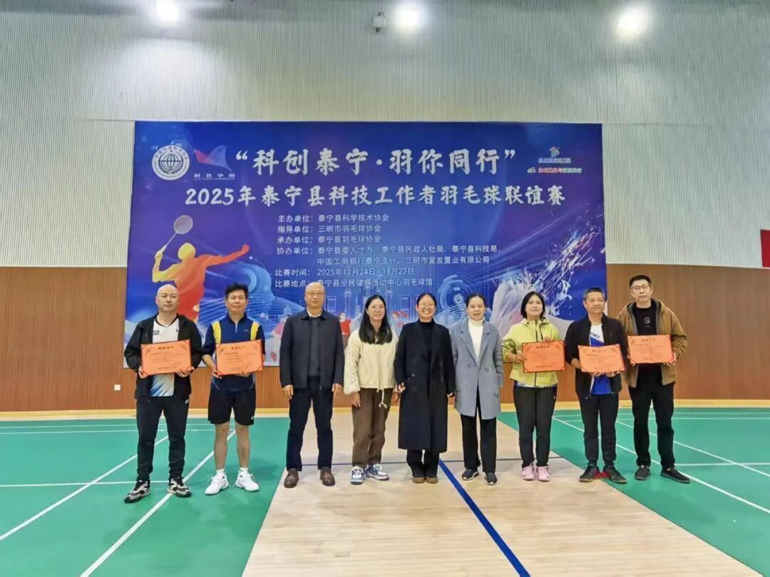 11月27日晚,為期四天的“科創泰寧·羽你同行”2025年泰寧縣科技工作者羽毛球聯誼賽在泰寧縣全民健身活動中心羽毛球館圓滿閉幕。賽事由泰寧縣科學技術協會主辦,縣委人才辦、縣民政人社局、縣科技局、工商銀行泰寧支行、宜發置業有限公司共同協辦,縣羽毛球協會承辦,旨在豐富科技工作者的業余文化生活,增進跨領域科技人才之間的交流與團結。