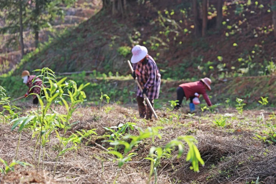 4月2日,在泰寧縣朱口鎮(zhèn)音山村黃精谷的果樹林間,村民們穿梭忙碌于果樹林間,為黃精苗除草、施肥。2025-04-05