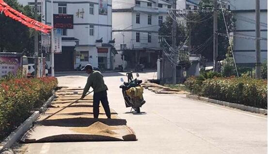 金秋九月,烈日當空,正值秋收晾谷的高峰期,各村村民為了方便直接利用公路晾曬稻谷。在岔路、拐角、農村道路等公路旁上鋪著各式各樣的草墊,墊子上晾曬著稻谷,有的村民為了防止車輛碾壓還在路面上碼上了石頭、樹墩、木棍作為路障。